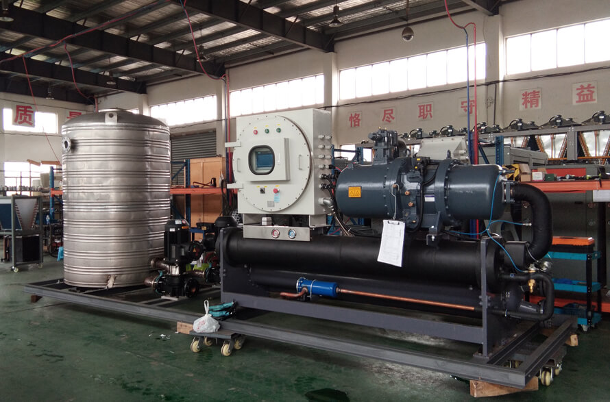 1、中溫一體式防爆螺桿低溫機組:出水溫度-5℃~-40℃,采用進口半封閉螺桿壓縮機組(帶經濟器);可提供-5℃~-45℃低溫乙二醇溶液或鹽水溶液;